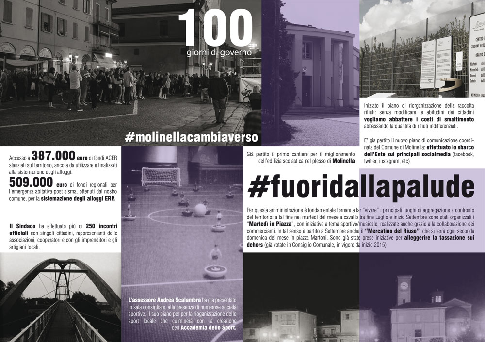 Contestualmente abbiamo portato avanti una serie di iniziative che hanno come scopo la rivitalizzazione dei luoghi centrali del paese: da molto tempo le piazze, le vie, i luoghi d’incontro di Molinella erano venute meno ad una delle loro funzioni principlai, cioè fornire motivo di incontro e aggregazione tra i nostri cittadini.
