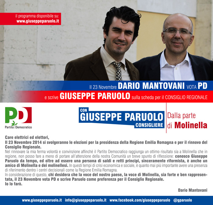 Nel rinnovare la mia ferma volontà e convinzione affinchè il Partito Democratico raggiunga un ottimo risultato sia a Molinella che in regione, non posso fare a meno di portare all’attenzione della nostra Comunità un breve spunto di riflessione: conosco Giuseppe Paruolo da tempo, ed oltre ad essere una persona di saldi e retti principi, sinceramente riformista, è anche amico di Molinella e dei molinellesi.